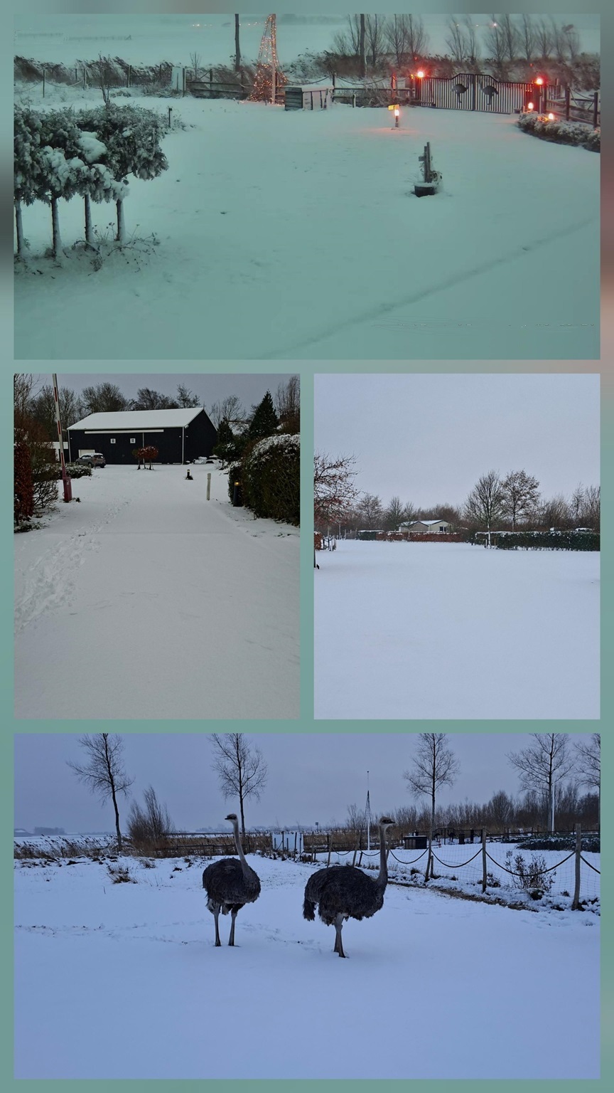 (Januari 2026) In de eerste week van het nieuwe jaar trok er een groot sneeuwgebied over Zeeland. De camping en weides veranderden in een prachtig ski-oord. Ook de struisvogels konden dit uitstapje naar de wintersport wel waarderen. Maar toch gaan ze de volgende keer liever naar een tropisch eiland.